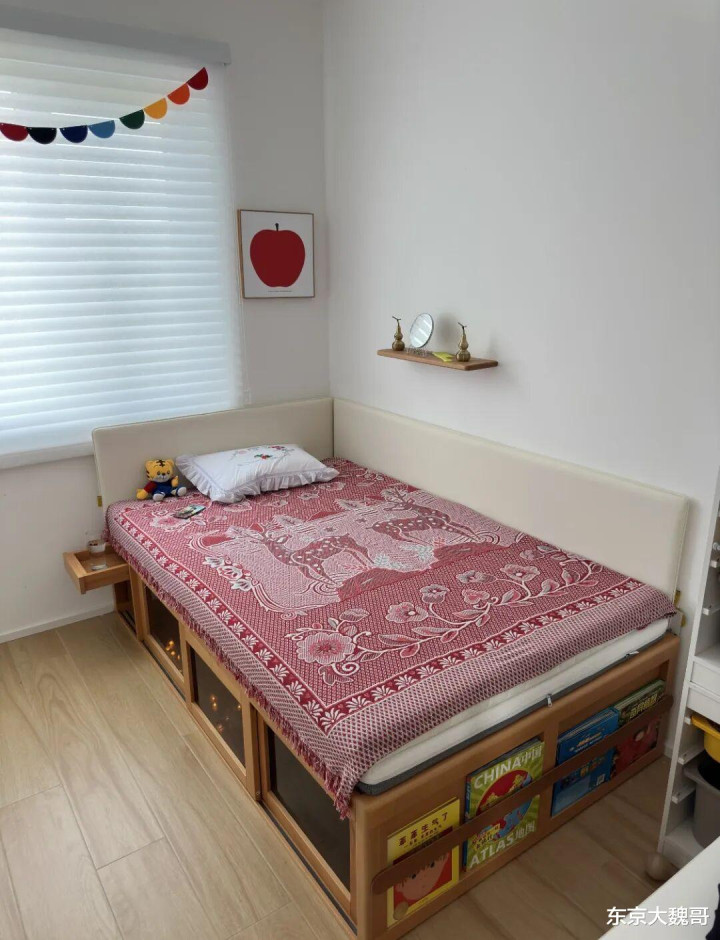 靠墙的单人床上,铺着婆婆最爱的大红花被子,搭配米色枕头,喜庆得像过年。