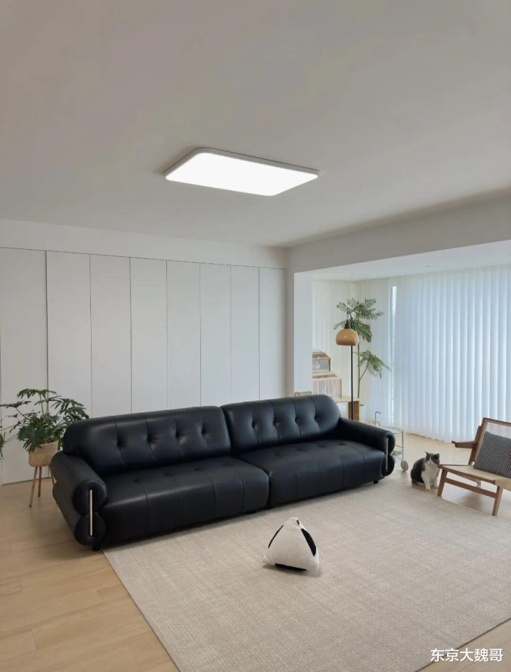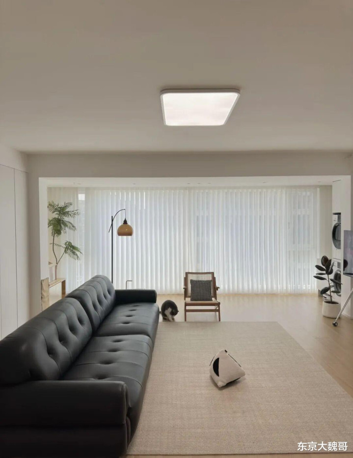 全屋大白墙,不做复杂背景墙,客厅两面墙做到顶的收纳柜,杂物全塞进去,家里永远显得清清爽爽。